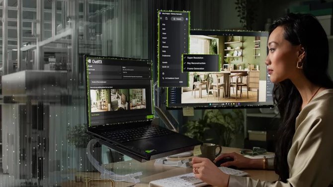 GeForce RTX ukáží naplno svou sílu také při práci s videem a grafikou. Ať už jde o softwarovou sadu od Adobe, DaVinci Resolve nebo oblíbené nástroje pro 3D software, desítky funkcí umí těžit z lokálně akcelerované AI. Odbourají se tím nudné a repetitivní činnosti jako maskování pozadí nebo objektů nebo ořez videa na různé formáty tak, aby sledoval požadovaný objekt. Díky DLSS, což je technologie navyšující snímkovou frekvenci známá především z her, je zase možné při práci s komplexními 3D scénami pracovat plynule s jejich věrným náhledem. AI zde také umí velmi efektivně potlačit šum ve scénách využívajících ray tracing.