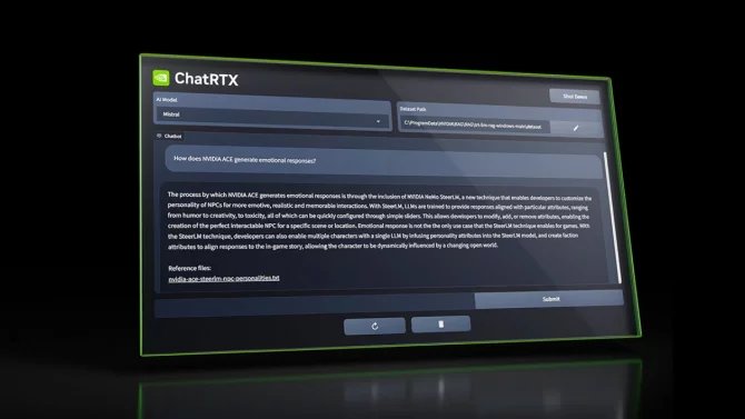ChatRTX je inovativní aplikace, která umožní personalizovat jazykový model (LLM) tím, že jí poskytnete vlastní dokumenty, poznámky, obrázky a další data, která uznáte za vhodná. K hledání přesné odpovědi mezi těmito zdroji využívá technologii retrieval-augmented generation (RAG) akcelerovanou pomocí GPU NVIDIA RTX. Díky tomu dokáže rychle a efektivně běžet I v lokálním prostředí a vaše data nikam neposílá. ChatRTX podporuje několik jazykových modelů, patří mezi ně Mistral, Llama nebo Gemma.