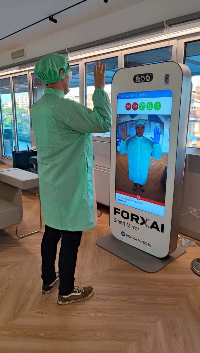 Umělá inteligence může přispět také ke zvýšení bezpečnosti pracovníků tím, že jim poskytuje inteligentní asistenci, varování a ochranu. Nejnovějším příspěvkem společnosti Konica Minolta k zajištění bezpečnosti na pracovišti je technologie FORXAI Mirror, která slouží k monitorování správného použití osobních ochranných pomůcek.
